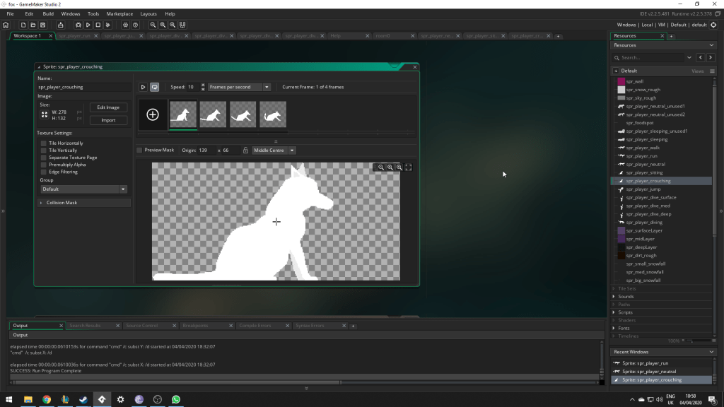 It’s a sprite containing progressively smaller sub-images that you can summon en-masse whenever you want a cloud of dust, or in my case, snow particles. I’ve tailored this in a couple of different ways; Firstly so that the fox now kicks out bits of snow behind her as she walks or runs and secondly so that snow flies up once she dives into it. It’s ridiculous how much nicer little touches like this can make your game look and I’m really happy with it.